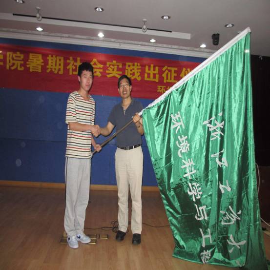 首先,由孙书记给暑期社会实践团队的学生代表授旗,他希望本次暑期实践可以取得圆满成功。然后,王连卿老师针对安全问题作出了几点注意事项——无论在何时何地,安全第一;队员务必服从负责人的安排,不得擅自离队外出;实践活动过程中也注意防暑等等。接下来,丁卫徐同学进行了暑期社会实践培训。首先,他给在场的各队员指出了暑期社会实践活动的意义——利用暑期实践去一展身手,奉献爱心,回报社会;同时,踏入苍茫的世界中去品尝世之初的香甜与苦涩。然后,就如何切合“科技支农农村行,环保宣传传浙江”这个主题给出了一些他自己的小小建议。最后,他对暑期社会实践的前期注意事项、团队成员的分工与合作、资金分配、费用报销、信息报送以及本次暑期社会实践评奖办法等一些容易被大家忽略的小细节进行了强调。就此,暑期社会实践出征仪式圆满结束。