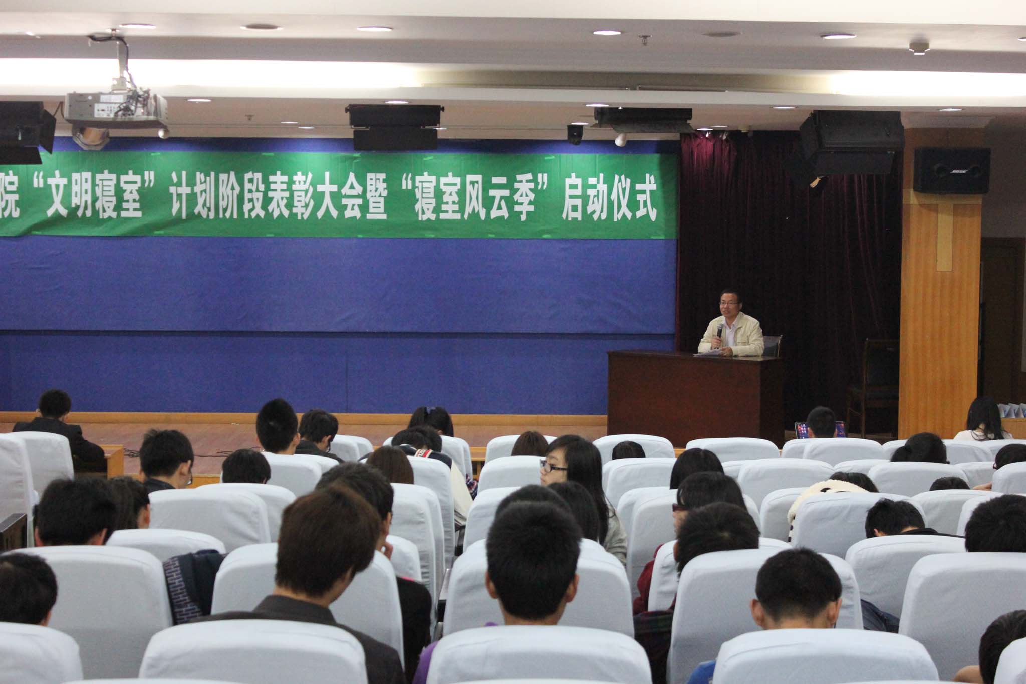2012年10月29日12:50,我院“文明寝室”计划阶段表彰大会暨“寝室风云季”启动仪式在图书馆二楼报告厅举行,参加大会的有学院学办主任宋志军老师,学院团委书记王连卿老师、方瑾老师,还有来自全院各班班长、团支书以及全院各寝室的寝室长。大会由宋志军老师主持。