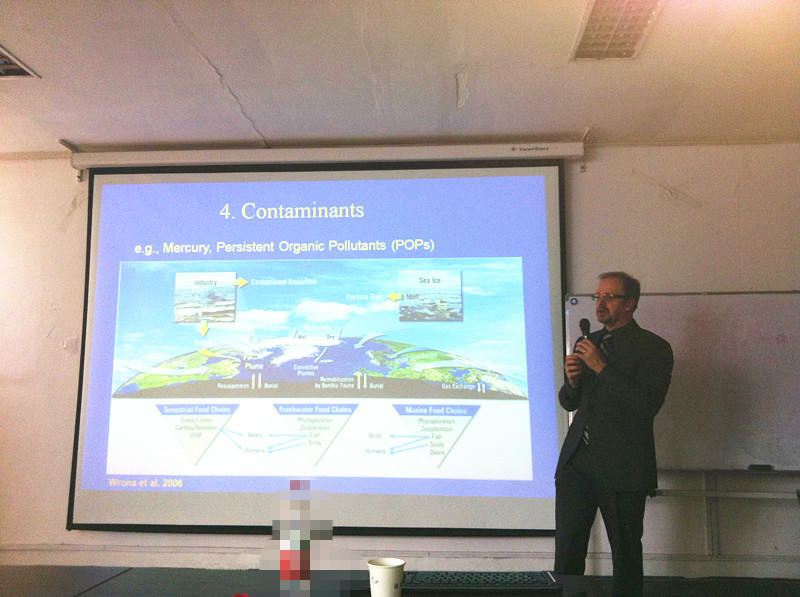 在讲座中,Blais教授以自己北极考察的亲身经历,结合污染和气候的变化研究的最新进展:包括环流模式、降水模式、海洋冰覆盖和永久冻土、水文和生物变化方面的内容,分析了北极环境变化对环境污染物迁移转化的影响,特别强调了冰冻圈、表层水水文、污染物富集以及生物迁徙的改变对加拿大北部的多重压力和挑战。