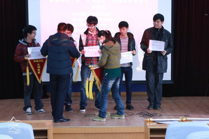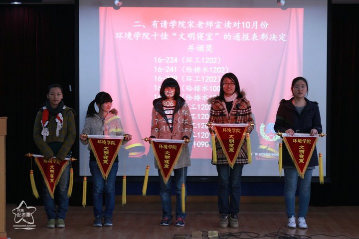 11月27日下午1:30,环境学院10月“文明寝室”表彰大会于图书馆二楼报告厅隆重举行,与会人员有全体大一同学、优秀寝室寝室长以及宋志军老师,本次大会由学生会权益部主持。