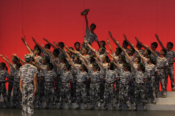 9月18日晚,由浙江工商大学军训师和校团委主办的2013年“军歌嘹亮”歌曲大赛在下沙校区剧院隆重举行。军训师师长张雪军,政委陈为人,参谋长刘海生及学校机关职能部门的领导、各学院学生工作负责人以及各学院军训指导员们出席了此次活动,全校17个学院的近2000名学生参加了此次活动。我院合唱队以精准的指挥、嘹亮的声音、精彩的情景表演、完美地诠释了《游击队之歌》,最终以94分的高分取得全场比赛第一名的好成绩。