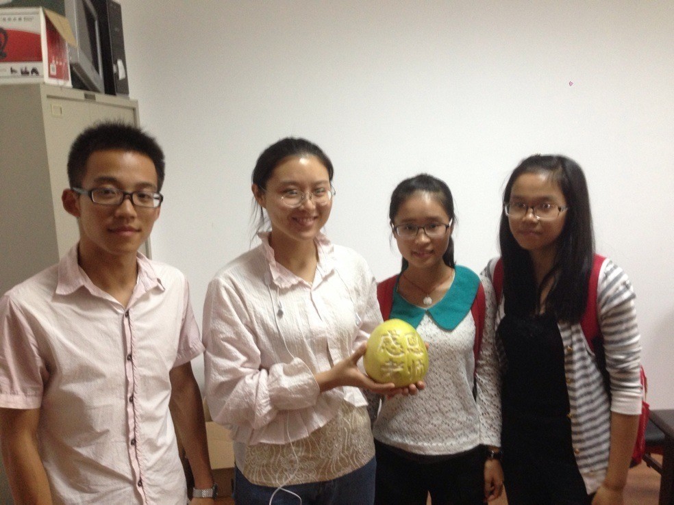 28日下午,环境学院青志队的数名队员拎着提前雕刻好的柚子来到了逸夫楼3楼的教师办公室。他们的到来让还在正在办公的老师们倍感惊喜与感动。在送上精心装饰的柚子及祝福的话语后,老师们与学生进行了亲切地交谈,老师们对这次9.28教师节“水果贺卡”活动都表示了大力支持与鼓励,其中宋志军老师还对活动进行了深入指导,给予了很多实际性的意见。