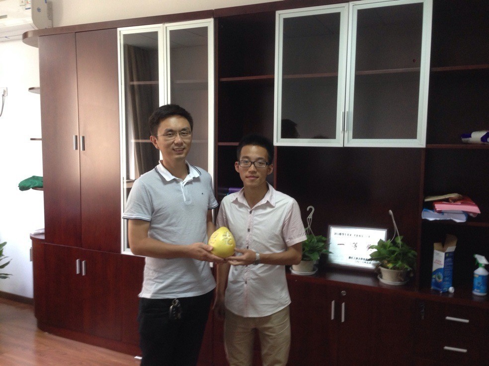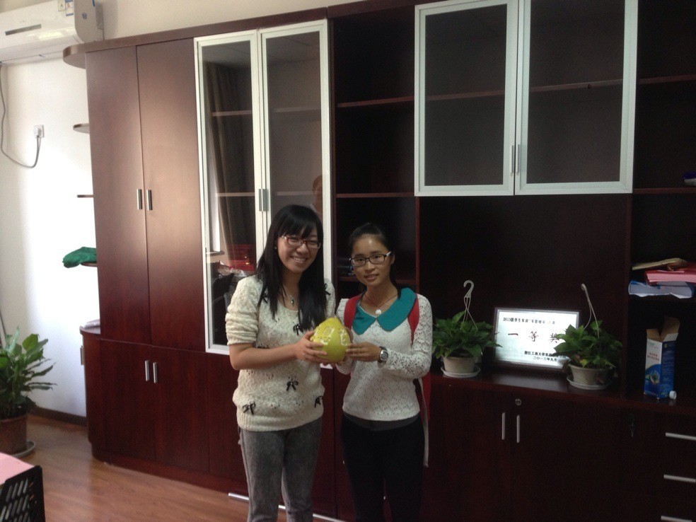 2013年9月28日下午2时,浙江工商大学环境学院青志队的队员们来到浙商大逸夫楼教师办公室,为数位办公室的老师敬上一份物情轻义重的“水果贺卡”——由同学们亲手制作的刻着“感恩老师”4个字的柚子——作为教师节的礼物。