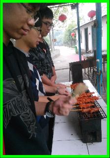 上午十时许,乘车上山,至烧烤地点。尽皆准备,烧烤事宜准备停当,使扇扇风,故炭火急速上升,蒙锡纸于烤架之上,抹油。乃置抹油之食物于锡纸之上,反复翻滚,反复涂抹油,洒香料于其上。顷时香气四溢,又无何,食物熟,各人尽皆食之。甜美之笑容溢于面。然因各学生不擅长烧烤,故有人数次烧锡纸,甚为惊慌,亦甚为兴奋。食物虽焦而美味也。此乃人之自我所煮食食物也,内含汗水并快乐也。