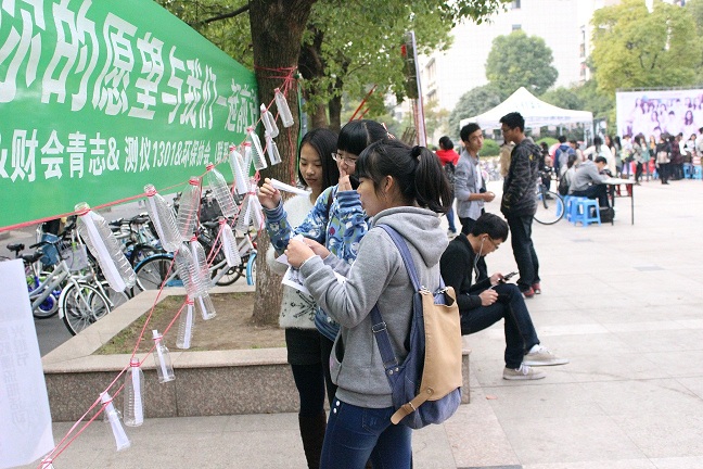 为了迎接即将到来的11•11光棍节,我们环境学院青年志愿者服务队联合其他学院一同举办了漂流瓶活动。该活动是由香港环保协会联合全国百所高校主办的。“愿望漂流瓶”,顾名思义就是把各自的心愿写在纸上然后放在漂流瓶(废旧饮料瓶)里,通过中间的相关组织来传达大家的心愿,或者也可以送到指定的人手中,成为定向漂流瓶。因为本次活动联合了全国百所高校一起参与,甚至可以实现全国各高校间的心愿传递。