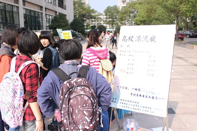 我校的漂流瓶活动联合了环境青志、信电青志、财会青志、信息青志、人文青志以及环保协会共6个社团共同举办。在10月30日,我们就开始了该活动的宣传工作,首先我们通过制作海报和横幅来宣传该项活动,之后在11月2日,我们在流水拍了一段名为《屌丝的逆袭》的视频,该视频讲述了一个屌丝光棍为了“脱光”,在光棍节借此活动去寻找心中的女神的故事,通过这种新颖的形式,我们的“漂流瓶”活动有了更高的知名度。11月4日我们开始进行下寝室宣传,同时收集他们的心愿和空瓶,寝室内的宣传一直持续了四五天。在11月6日,我们在流水广场设点进行宣传,每个小干事都积极的参与,有的人负责发传单,还有一部分同学负责主持介绍。在初秋依旧强烈的阳光下,小干事们努力宣传,即使口干舌燥也不愿休息的精神让人十分感动与钦佩。