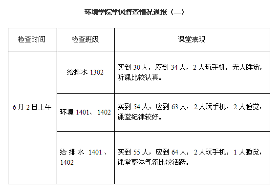 根据《环境学院关于开展学风建设专项行动的通知》,学院学风督导小组于2015年6月2日对部分班级上课情况进行检查,具体情况通报如下:
