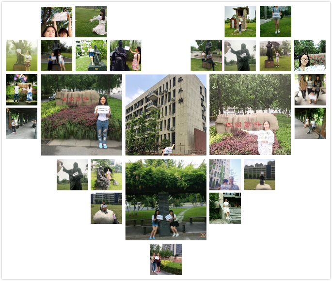 五天的合影关键词从“和平绿”、“名人绿”到后来的“校训绿”、“爱情绿”以及最后回到环境学院逸夫楼的“逸夫绿”,五天五个不同的关键词,近两百张照片,地点从最初的鸽子广场一直到逸夫楼,参与活动的人员从学生到老师,“你好,绿色”定向合影大赛响应“践行绿色生活”的主题,更是给了大家一个展示自我的平台,了解学校学院文化的机会。