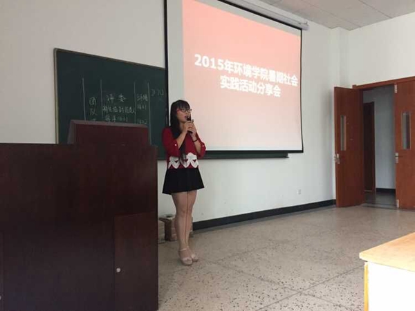 9月18日下午,环境与工程学院2015年暑期社会实践活动分享会在逸夫楼120室举行,到会的嘉宾有党委副书记余彬老师、团委书记丁汀老师、辅导员石周燕老师、团委助理张卉佳,会议由环境学院团委组织部部长文智君主持,共有10个暑期实践小分队参与分享。