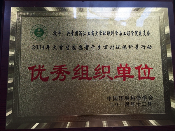 近日,中国环境科学学会对2014年大学生志愿者千乡万村环保科普行动优秀单位和个人进行表彰,我院大学生志愿者千乡万村环保科普行动获得表彰。其中,我院团委获评2014年度“大学生农村环保科普行”优秀组织单位。我院丁汀老师获评优秀指导教师、曹琦同学被评为2014年度“大学生志愿者千乡万村环保科普行动”优秀志愿者、浙江工商大学赴塘栖社会实践小分队被评为2014年度“大学生志愿者千乡万村环保科普行动”优秀小分队以及浙江工商大学环境学院学生会被评为2014年度“大学生志愿者千乡万村环保科普行动”优秀社团。