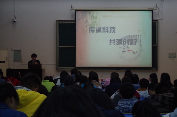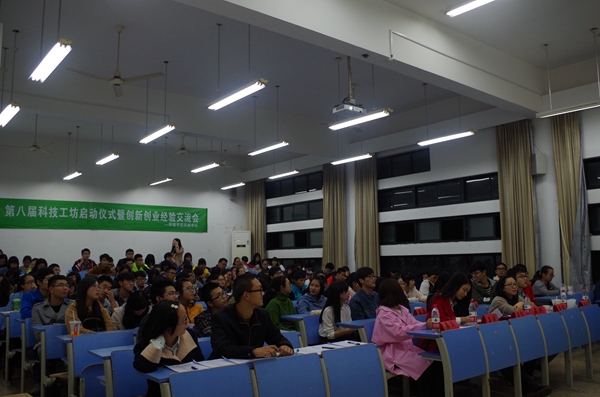 11月13日晚,环境学院第八届“科技工坊”启动仪式在E220进行到会的嘉宾有团委书记丁汀老师、团委助理张卉佳。“挑战杯”国赛铜奖、省一等奖的获得者钟振宇和中国青年创新创业大赛创意组冠军的蒋璐与参加仪式的180多名大一新生、创新创业项目团队成员交流,分享创新创业经验。