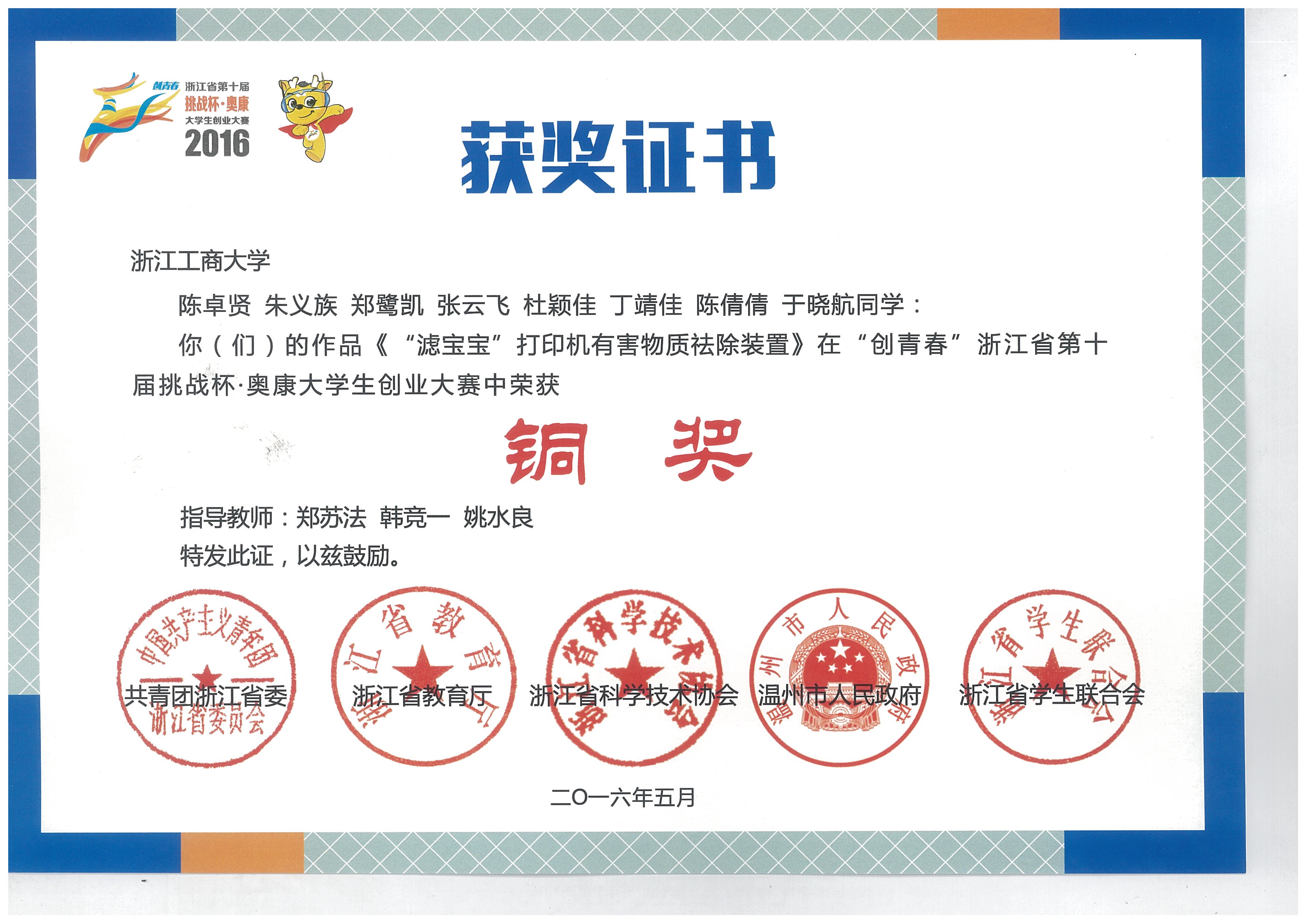 2016年 5月22日,由团省委、省教育厅、省科协、省学联主办的浙江省第十届“挑战杯·奥康”大学生创业大赛决赛在温州医科大学圆满落幕。我院本科生作品《杭州光莲环保科技有限公司》(成员:刘妍秋、王泽远、杨海运、胡含蕾、吴慧斌、邬鸿哲、任俊宇、郁璐芳;指导老师:王齐、郑苏法)获银奖,本科生作品《“滤宝宝”打印机有害物质祛除装置》(成员:陈卓贤、朱义族、郑鹭凯、张云飞、杜颖佳、陈倩倩、丁靖佳、于晓航;指导老师:姚水良、韩竞一、郑苏法)获得铜奖。