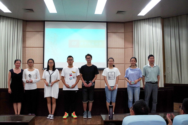 接下来是发放“心连新”卡片环节。郑苏法老师和余彬老师一同将印有全体学院领导、班主任、辅导员、和班主任助理姓名、联系电话的“心连新”卡片交给新生班各班代表,并与他们亲切握手,合影留念。