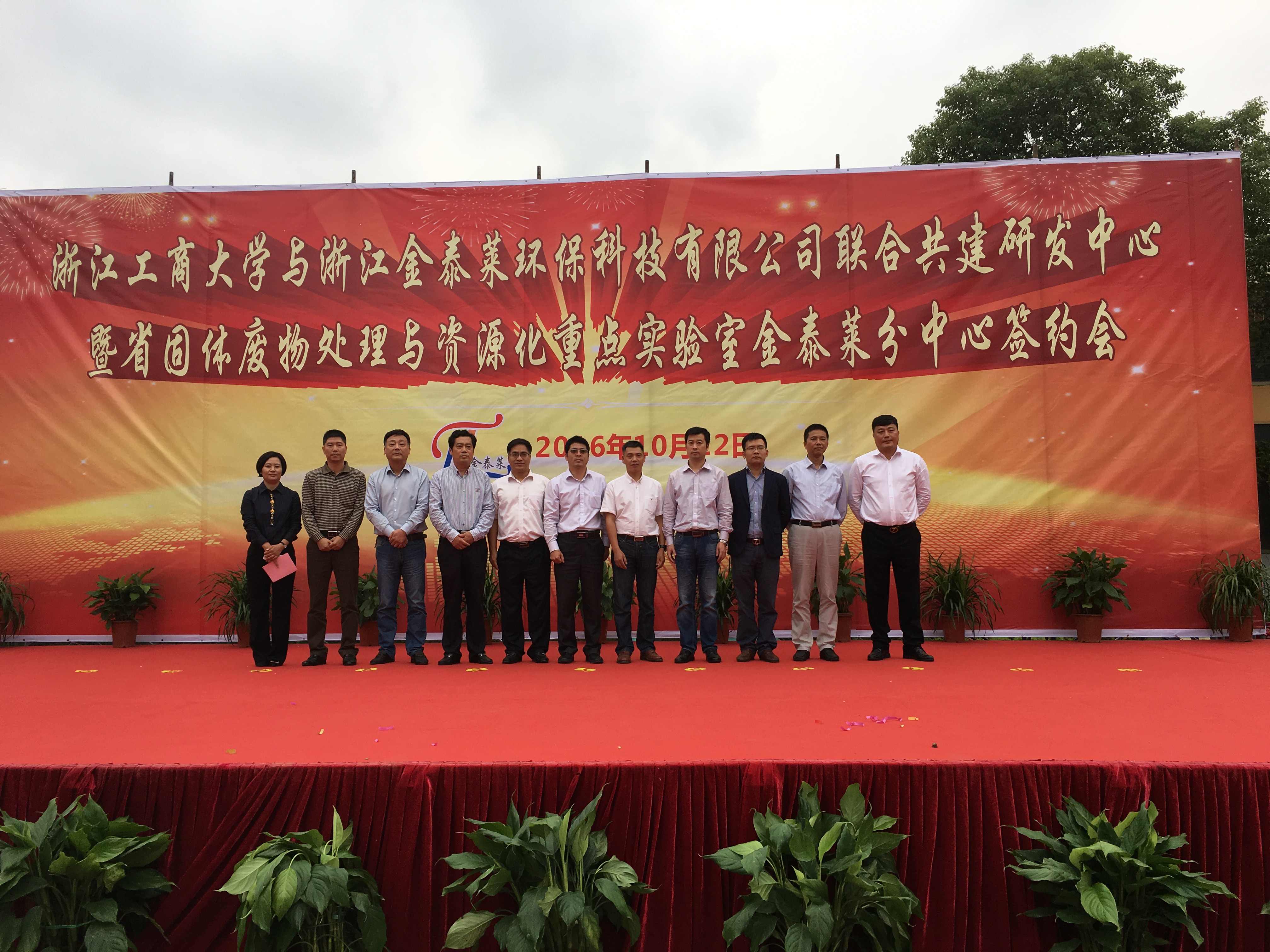 2016年10月12日下午,浙江工商大学与浙江金泰莱环保科技有限公司联合共建研发中心暨省固体废弃物处理与资源化重点实验室金泰莱分中心签约仪式在兰溪举行。 兰溪市领导范卫东、徐亚平、汤浩江、朱恒德,浙江工商大学苏为华副校长、科技处副处长陈宇峰处长、环境学院党委书记郑苏法,浙江省固体废物处理与资源化重点实验室主任沈东升教授,以及浙江金泰莱环保科技有限公司董事长戴云虎参加签约仪式。