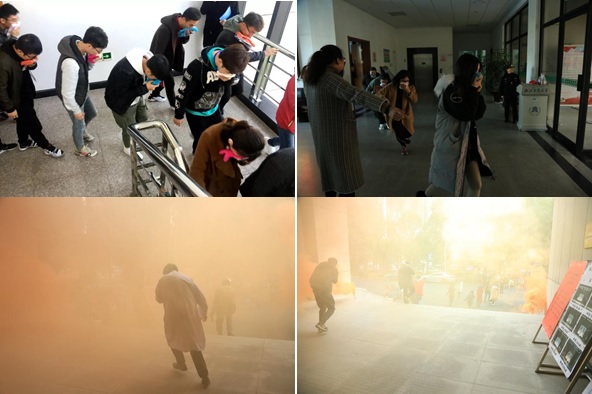下午2点30分,随着消防警报响起,本次活动的第二项,消防逃生演习正式开始,参加逃生的师生一手用湿毛巾捂住口鼻,一手扶墙,弯着腰快速有序地疏散至楼外空地。疏散结束,马教员再次为同学们强调了逃生过程中应注意的细节。