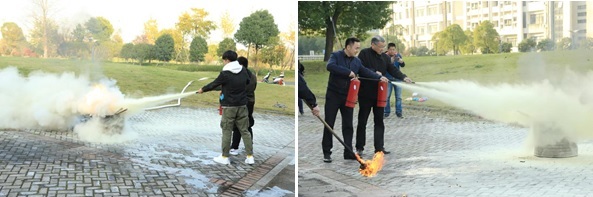 本次活动的最后一个环节是干粉灭火器的使用教学和实际操演。马教员从干粉灭火器 “拔插销”、“倒立摇晃”到“灭火姿势”的一整套完整流程给大家做了详细的指导。活动现场还为每一位师生准备了干粉灭火器,让大家能够亲自参与体验灭火操作。参加本次活动的很多师生都是第一次使用灭火器灭火,通过理论学习和亲自灭火,让大家收获颇丰。