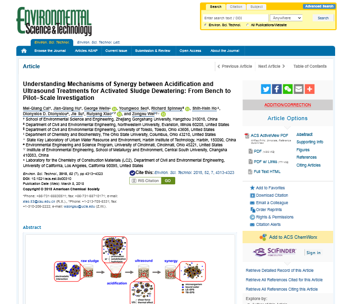 据科睿唯安(Clarivate Analytics)集团《基本科学指标》(Essential Science Indicators,简称ESI)2019年03月19日最新数据显示,我院蔡美强老师以第一作者发表的SCI论文《UnderstandingMechanisms of Synergy between Acidification and Ultrasound Treatments forActivated Sludge Dewatering: From Bench to Pilot-Scale》(https://pubs.acs.org.ccindex.cn/doi/10.1021/acs.est.8b00310)进入ESI(1%)高被引论文之列,所属一级学科为环境科学与工程。