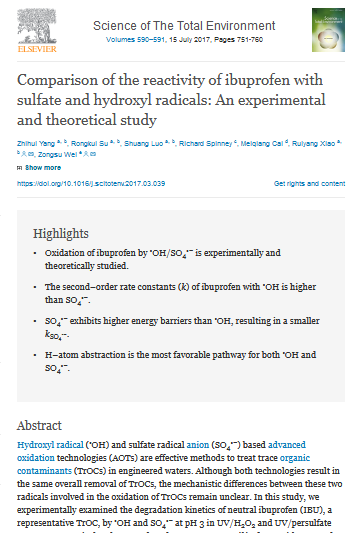 同时,蔡美强老师合作发表的《Comparison ofthe reactivity of ibuprofen with sulfate and hydroxyl radicals: An experimentaland theoretical study》(https://www.sciencedirect.com/science/article/pii/S0048969717305442)也进入ESI(1%)高被引论文之列。