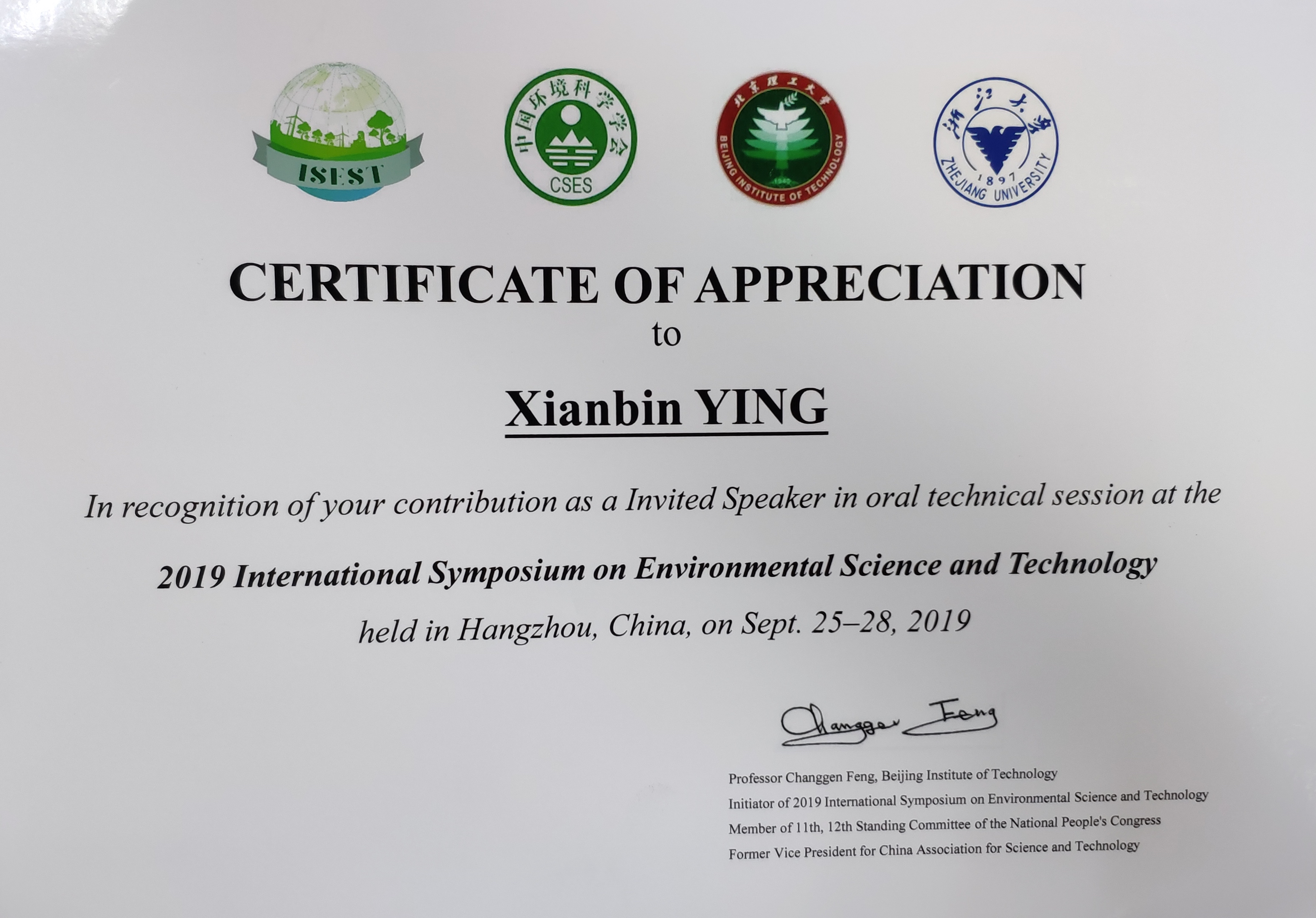 我院2018级研究生应贤斌同学应邀参加了“2019环境科学与技术国际会议(2019 ISEST)”,会议于 2019 年 9 月 25-28 日在杭州之江饭店隆重举行。本次研讨会的目的是为环保领域提供有关环境科学和技术的最新进展,会议内容包含:1)水体污染与防治;2)大气污染与防治;3)土壤(固废)污染与防治;4)废物处理与利用;5)环境监测与评价;6)环境毒理;7)环境化学;8)生态修复;9)环境可持续技术;10)生物质及可再生能源。近200位国内外学者在会议上进行了主题演讲。