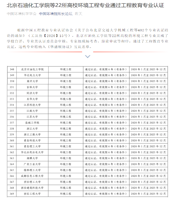 一喜:6月30日,中国工程教育专业认证协会公布402个专业认证结论,我校环境工程专业通过了工程教育认证。本次工程教育认证通过是国家一流专业建设点被确认为国家一流专业的前提条件。通过工程教育认证的专业将纳入《华盛顿协议》互认名单,我校环境工程专业工程人才培养能力获得了国际认可。