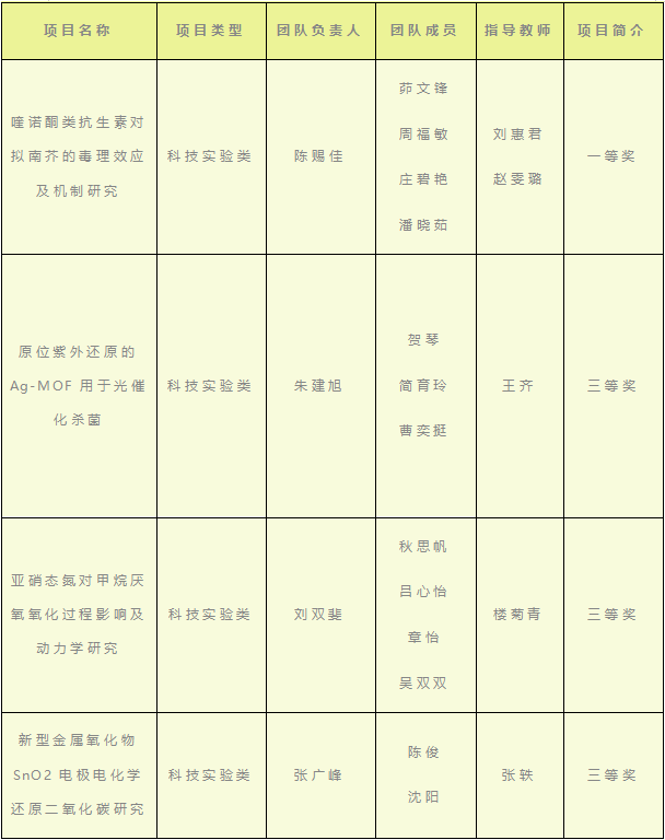 2020年11月21日至22日浙江省第三届大学生环境生态科技创新大赛决赛于在浙江师范大学举行。我院参赛项目《喹诺酮类抗生素对拟南芥的毒理效应及机制研究》获得一等奖,《原位紫外还原的Ag-MOF用于光催化杀菌》、《亚硝态氮对甲烷厌氧氧化过程影响及动力学研究》、《新型金属氧化物SnO2电极电化学还原二氧化碳研究》获得三等奖。
