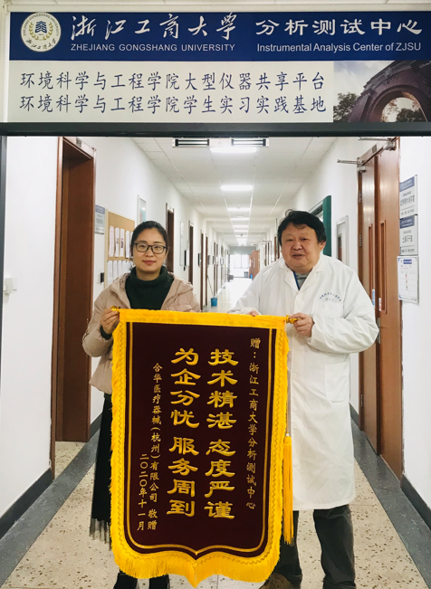 十一月底,浙江工商大学分析测试中心内,合华医疗器械(杭州)有限公司的技术人员送来了“技术精湛 态度严谨 为企分忧 服务周到”字样的锦旗,送到了中心检验检测主管高级实验师陈方老师的手上,以表示对中心、对陈老师的感谢。