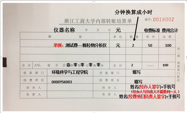 根据《浙江工商大学环境科学与工程学院实验中心仪器设备开放共享管理及服务收费办法(试行)》(环境办〔2018〕6号)文件及学院公布的收费标准,自2018年10月1日起院内大仪共享实行收费,现已将2019年12月1日至2020年12月31日期间大仪使用统计结果发送至各位使用老师邮箱,请仔细核对时长及费用,若无问题,请于5月20日前将内部转账结算单交至逸夫楼325办公室王晓青处,若有问题请联系,电话28008224,实验中心邮箱:hjxysyzx@zjgsu.edu.cn。校内结算经费项目:0000YS6003。请按财务相关要求打款,校内老师实行内部转账,内部转账结算单填写模板见下图。