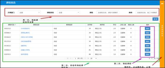 第三步:预选课程。在图2中,如预选课程较多,可以在预选条件区设置查询条件进行课程查询,然后在对应课程的最后操作列进行预选课程。预选课程后见图3: