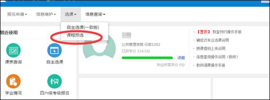 第二步:在菜单“选课”下选择“课程预选”,进入课程预选,具体界面见图1、图2: