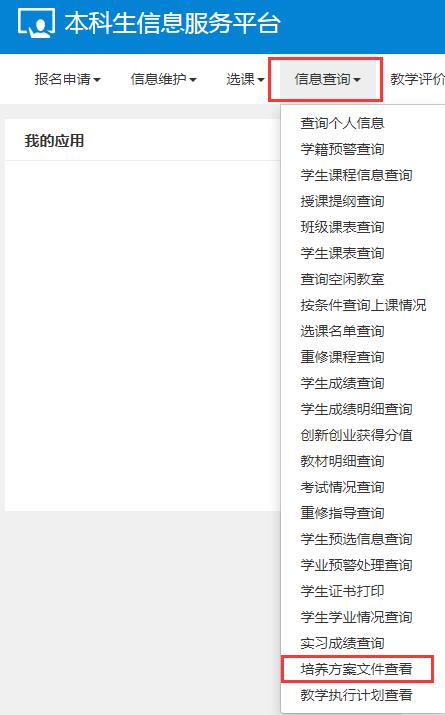 学生预选课前应先查看专业培养方案,熟悉个人学期应修课程:信息查询--培养方案文件查看
