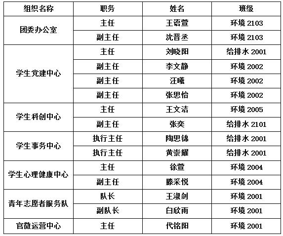 根据《关于做好2022年环境学院学生组织干部换届的通知》,经学生自主申报,院团委资格审查及面试考核,拟任用以下同学为团委办公室、学生党建中心、学生科创中心、学生事务中心、学生心理健康中心、青年志愿者服务队、官微运营中心主席团成员。具体如下: