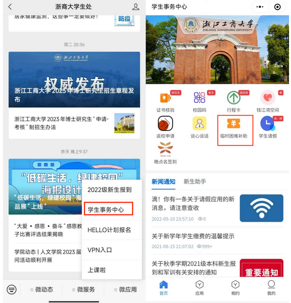 (一)2022年12月12日-2022年12月21日,申请学生进入“浙商大学生处”微信公众号——点击微应用——学生事务中心——临时困难补助模块,按照页面要求在线填写《2022-2023学年学生寒假交通补贴申请》,在申请填写时请仔细核对本人的工商银行卡号。(注:同学们在填写信息时,最后一栏需承诺以上填写信息真实有效,如有不实之处,愿意承担相应责任。)