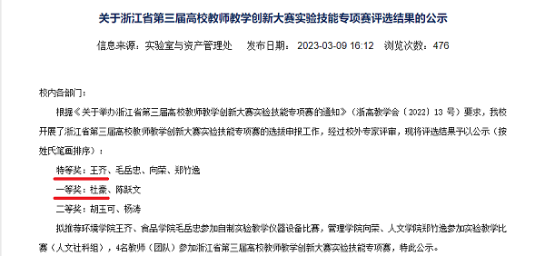 接下来,学校拟选派4名教师(团队)代表参加浙江省第三届高校教师教学创新大赛实验技能专项赛,王齐副院长将代表学校参加自制实验教学仪器设备比赛。