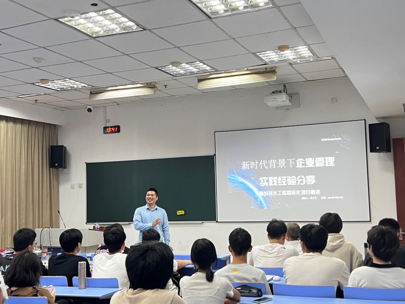 钟文生专家的讲座围绕“创业思考、公司成立、公司内外部管理、项目管理”以及“给排水工程智能化项目案例”等主题展开;并在互动问答环节,对“如何过好大学生活、如何更好面对初入职场、如何抉择工作与创业”等问题给出了很好的建议。
