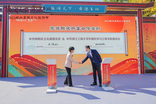 在2023绍兴虞舜文化旅游节开幕仪式上,柯桥区王坛镇党委书记毛佳丽和环境学院党委书记狄瑞波分别代表双方单位签署了党建联建协议。
