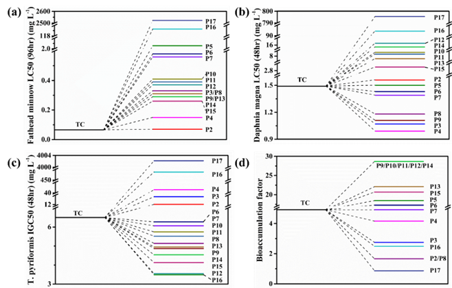图4 急性毒性(a)黑头鲦鱼,(b)大水蚤,(c)梨形绦虫和(d) TC及其降解中间体的生物积累因子