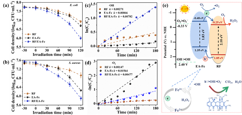 图5 可见光照射下(a)大肠杆菌和(b)金黄色葡萄球菌失活曲线,(c) 不同催化剂生成•OH和(d)•O2-的动力学曲线,(e) RF/EA-Fe催化剂在可见光照射下的机理图