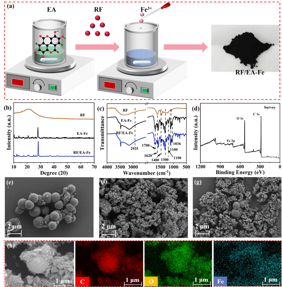 图1 (a) RF/EA-Fe的制备流程图,各催化剂的 (b) XRD ,(c) FTIR谱,(d) RF/EA-Fe的XPS谱,各催化剂(e) RF, (f) EA-Fe, (g) RF/EA-Fe的SEM图和(h) RF/EA-Fe的EDS