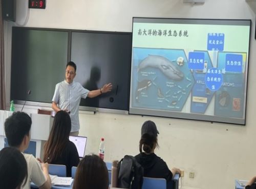 课程伊始,赵老师首先为同学们介绍南极的地理位置、面貌和资源特征,南极冰川变化等,并为同学们展示了南大洋的海洋生态系统的特殊性和重要性。随后,他为同学们讲解了南极科考工作的主要研究内容和所需的设施设备,如采集海水测定水体中的营养盐、POC,带领学生认识生源物质通量和组成的时间序列变化;利用沉积物捕获器采集海底沉积物,探究沉积物中活性铁含量及与有机碳的关系;冰间湖特殊生境中的营养供给和生态响应等。
