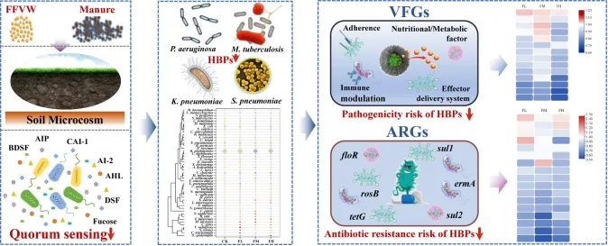 病原体在环境中的增殖、进化和传播广受关注。土壤是HBPs的重要宿主,土壤中的腐殖酸、营养元素、矿物质等营养物质的增加会加快HBPs的传播,增强其耐药性。尤其是含有ARGs和VFGs的高危HBPs,可通过作物和动物传播给人类,从而损伤人体免疫系统,造成一定的负面健康效应。不同于化学消除法对土壤生态系统的破坏,大量水果和蔬菜废弃物具有高度可生物降解性和环境友好型。果蔬垃圾发酵液(FFVW)具有显著改良土壤和减少ARGs污染的能力,比如磺胺类药物、大环内酯-林科胺-链霉素、氯霉素、四环素耐药基因等。通过进一步分析显示FFVW的化学和生物组分能有效抑制HBPs的群体感应(QS)减少毒力因子的分泌,但通过QS绿色削减土壤中携带VFGs/ARGs的HBPs的潜力仍然未知。