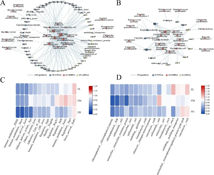 网络显示(A) CK样本和(B) FFVW应用样本中HPB、VFG和ARG之间的共现模式。节点被着色以指示HPBs和ARGs之间的差异,线条表示正相关。相对于CK的危险HBP相关的(C) VFG和(D) ARG丰度的倍数变化。