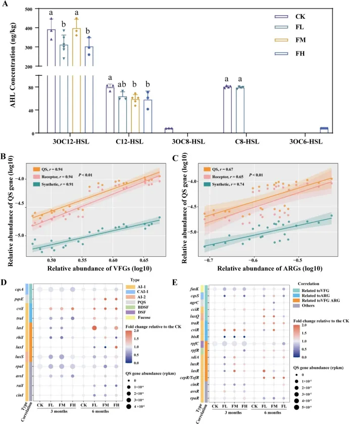 (A)FFVW处理土壤中信号分子AHLs的变化。(B)ARGs与QS基因间的线性回归分析。(C)VFGs与QS基因间的线性回归分析。不同小写字母表示处理间差异显著(P < 0.05)。不同处理中(D) QS合成基因和(E) QS受体基因的变化。