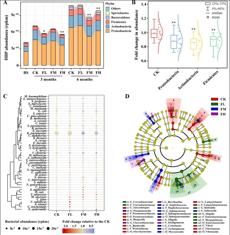 (A)门水平上潜在HBPs的丰度。(B)18个FFVW组中三个主要门中潜在HBPs的倍数变化。其中*和**分别表示P < 0.05和P < 0.01。(C)暴露于6个月FFVW后不同处理中危险HBPs的倍数变化。气泡的颜色表示不同处理与CK相比的倍数变化。(D)6个月时不同处理中HBPs分类群的LEfSe分析。进化分支图说明了从门到属的分类级别,圆圈从内向外辐射。对数LDA得分的阈值设定为3.0。倍数变化值 < 1表示HBP丰度减少,而值 > 1 表示HBP丰度增加。BS,背景土;CK,未是用FFVW;FL,36 mL/kg FFVW;FM,171 mL/kg FFVW;FH,342 mL/kg FFVW。