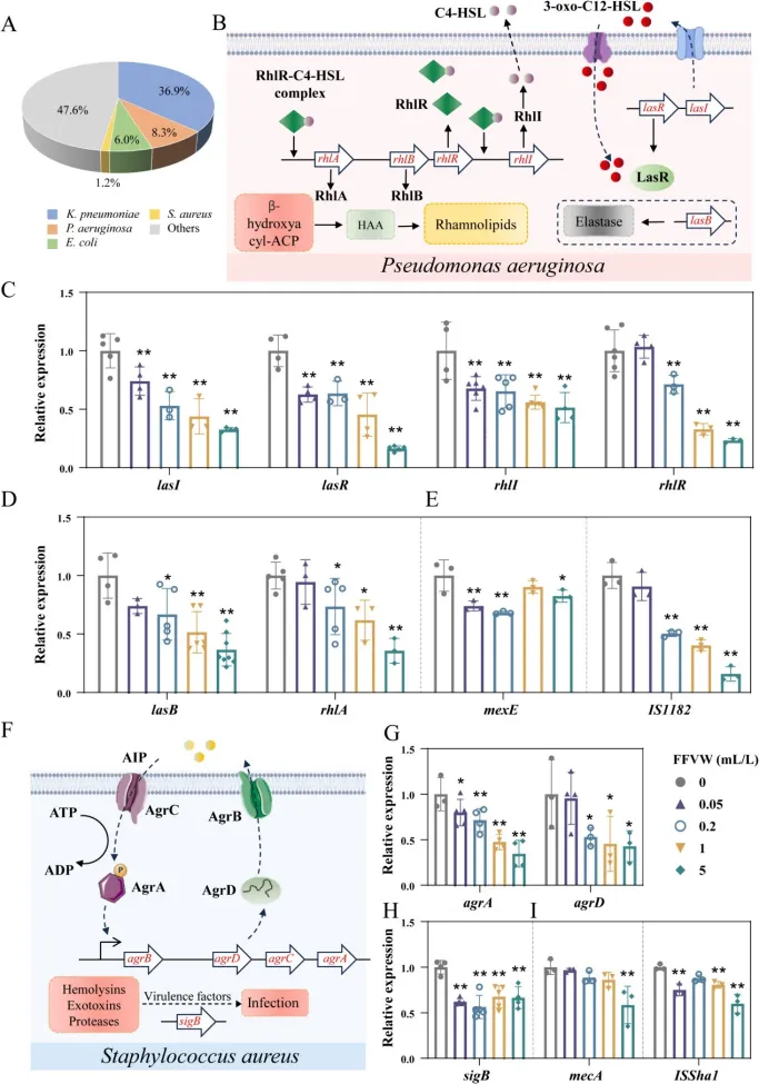 (A)铜绿假单胞菌、大肠杆菌、肺炎克雷伯菌和金黄色葡萄球菌在总危险HBPs中所占比例。(B)铜绿假单胞菌QS回路示意图。(C)铜绿假单胞菌QS基因的基因表达水平。(D)铜绿假单胞菌VFGs的基因表达水平;(E)金黄色葡萄球菌ARG和MGE基因的基因表达水平。(F)金黄色葡萄球菌QS回路示意图。(G)金黄色葡萄球菌QS基因的基因表达水平。(H)金黄色葡萄球菌VFG的基因表达水平。(I) 金黄色葡萄球菌ARGs和MGEs的基因表达水平。