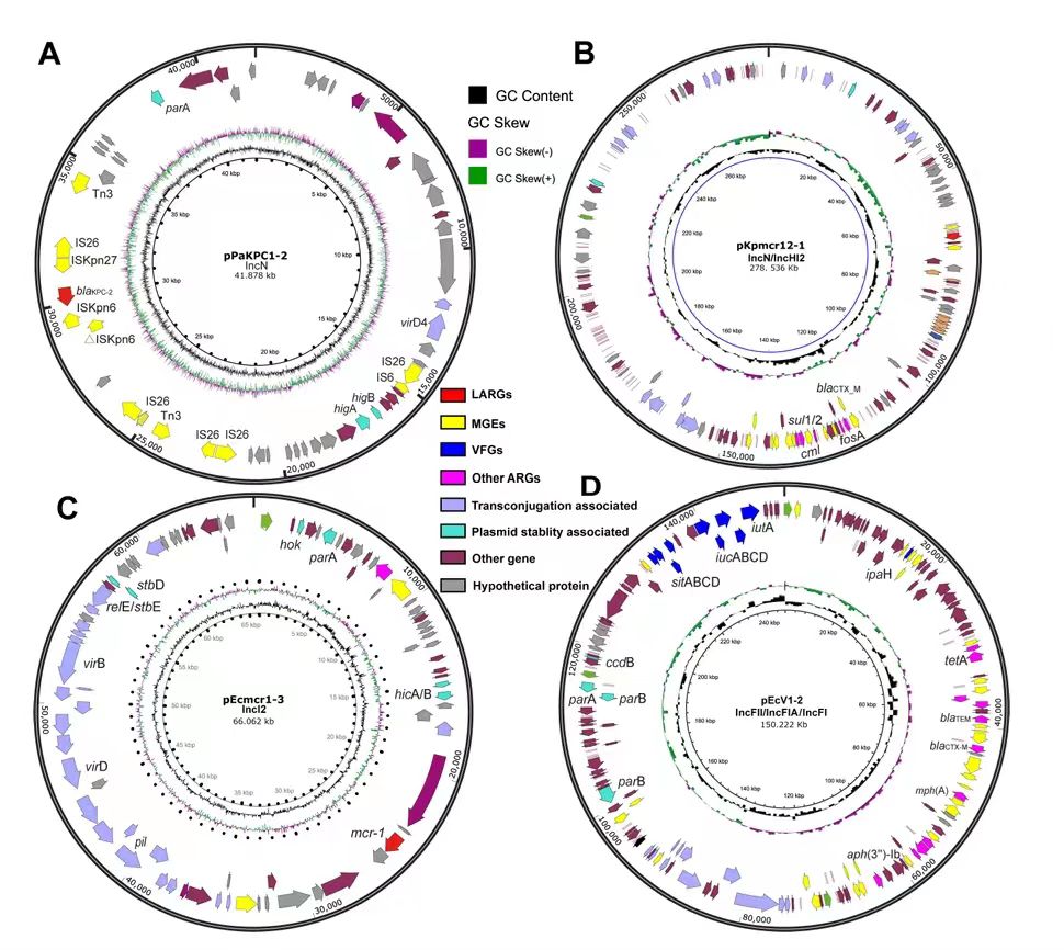 图1. 质粒中LARGs和VFGs的遗传环境