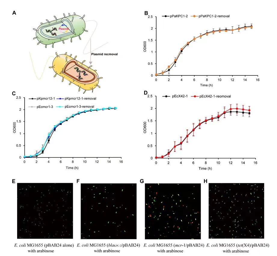 (A)去除携带LARG的质粒的示意图。(B)铜绿假单胞菌GSK002存在或不存在blaKPC-2携带质粒pPaKPC1-2的体外生长曲线。(C)肺炎克雷伯菌GSM302存在或不存在质粒mcr-1-携带pKpmcr12-1和大肠杆菌GSM102存在或不存在mcr-1-携带质粒pEcmcr1-3。(D)大肠杆菌GSX402存在或不存在tet(X4)携带质粒pEcX42-1。(E-F)用L-阿拉伯糖处理并用LIVE/DEAD® 染色的携带LARG的大肠杆菌MG1655存在或不存在的代表性共聚焦激光扫描显微镜图像。绿色和红色分别代表活细胞和死细胞。