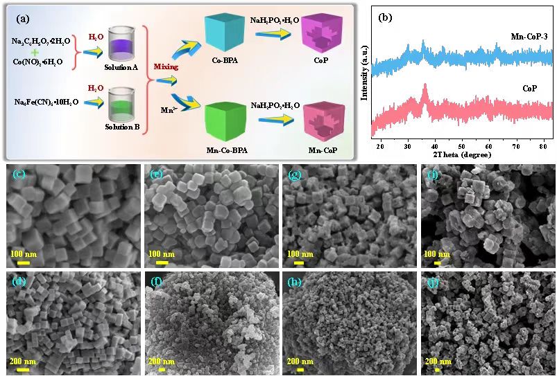 图1. (a) 纳米酶合成示意图。(b)XRD图谱。电镜图:(c,d) Co-BPA,(e,f) Mn-Co-BPA,(g,h)CoP,(i,j)Mn-CoP。