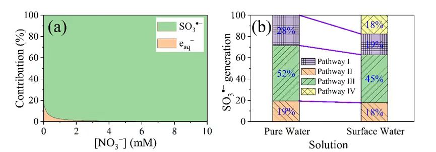 图5. 亚硫酸根自由基作用规律:(a)硝酸盐影响,(b)生成与转化规律