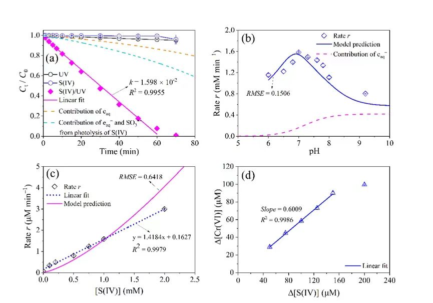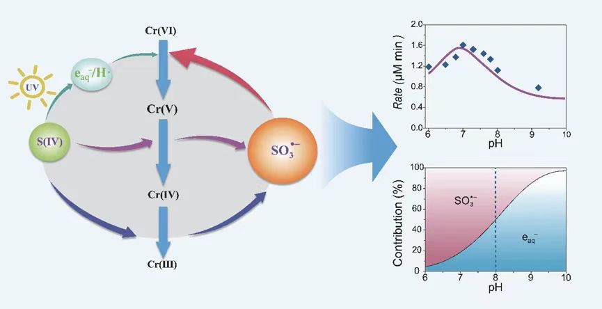 本研究在课题组前期工作基础上(ES&T 2012, Water Res. 2014, Water Res. 2018, Water Res. 2018, ES&T 2019, Water Res. 2022),进一步从自由基生成转化与反应特性角度推进了相关探索,发现了具有高选择性的新型亚硫酸根自由基(SO3•–)对近中性水质中Cr(VI)具有很高还原活性(~5.3×106 M–1 s–1),揭示了该自由基的原位生成原理,通过模型方法量化解析了自由基的贡献,从而构建了基于S(IV)/UV的高级氧化/还原的除Cr(VI)新体系,为饮用水、工业废水等复杂水质中Cr(VI)及总Cr高效去除提供了新方法。