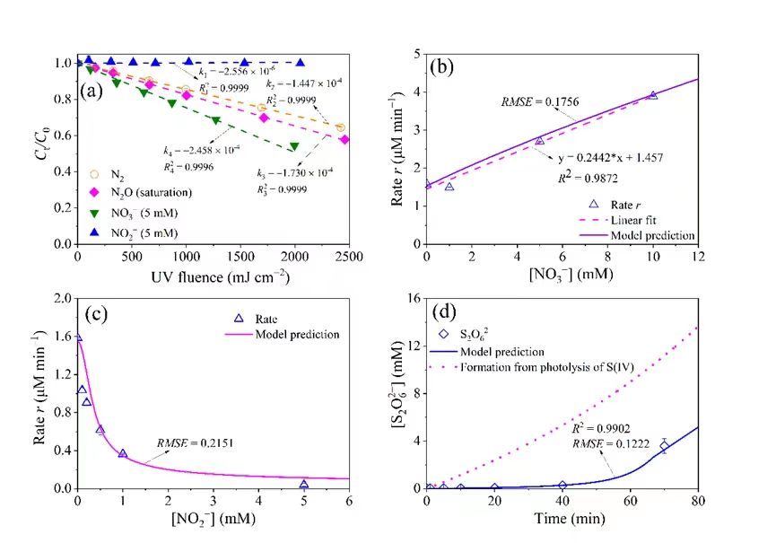 图2. (a)典型淬灭剂影响,(b)硝酸盐影响,(c)亚硝酸盐影响,(d)S2O62−生成规律